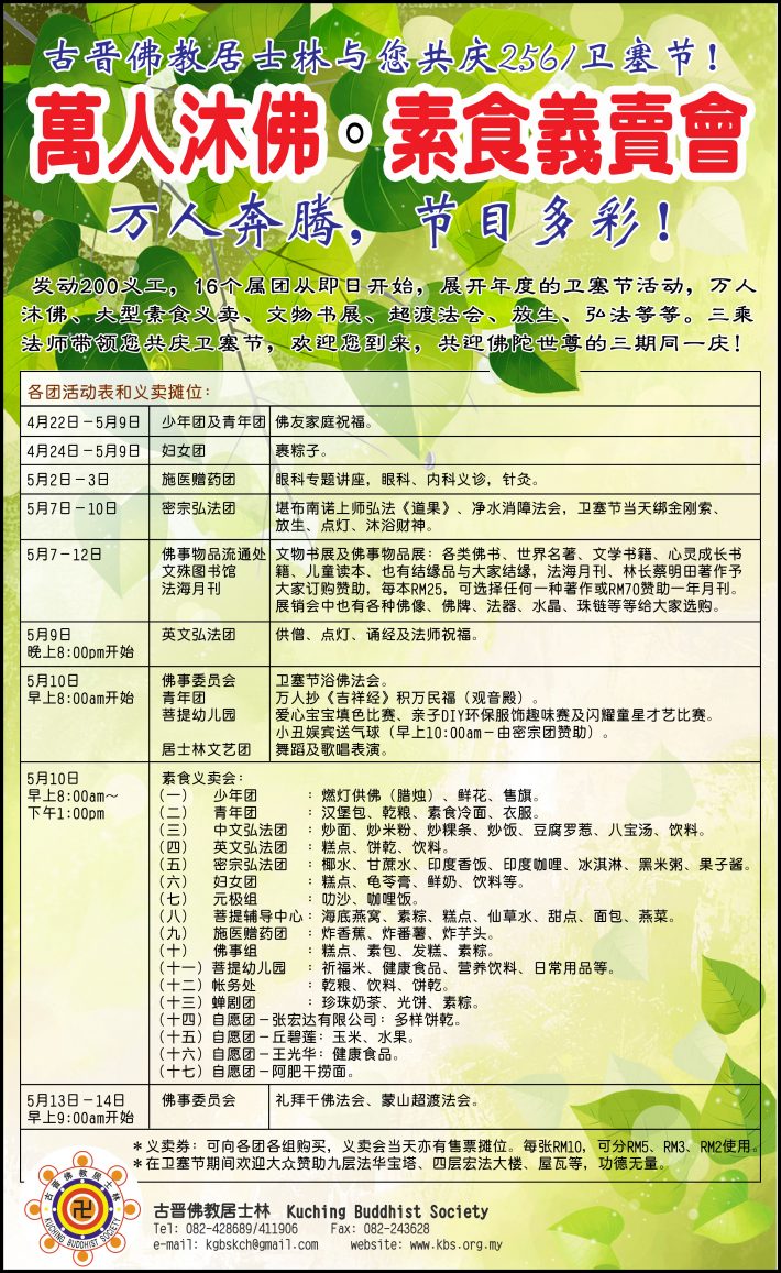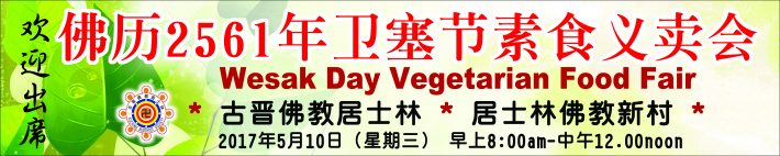 今年的2561卫塞节是在5月10日(星期三)。本林将于当天早上8时开始沐佛颂经仪式,并在郑和统帅路林所举行一年一度的素食义卖会,而佛教新村也将于5月10日当天早上8时举行沐佛仪式,和同步举办素食义卖。