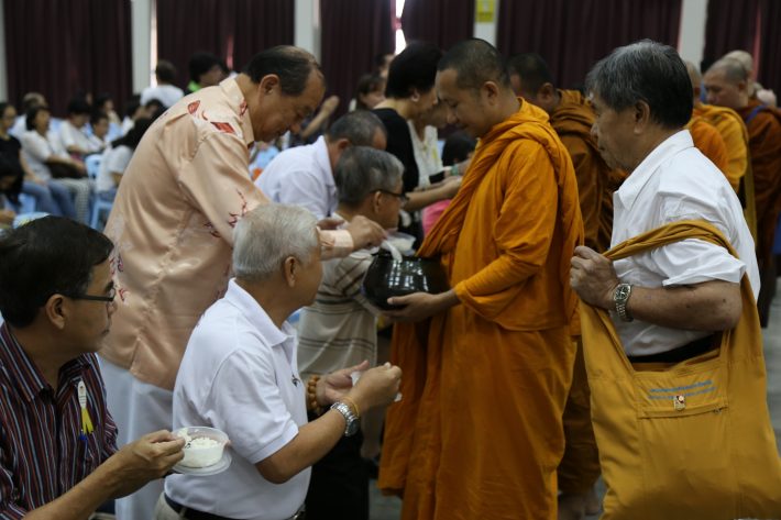 2016年马来西亚佛教居士总会总会长蔡明田居士与居总理事们参与国际斋僧育僧大会。图示:蔡明田总会长供僧时影。