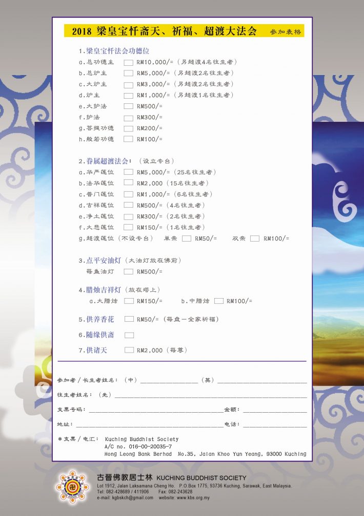 该法会并设有各项赞助栏目,让施者启建功德,祈愿诸界善信佛友踊跃报名赞助,为自身家人种下珍贵殊胜的菩提福田。立即联络该林秘书处以索取报名表格。