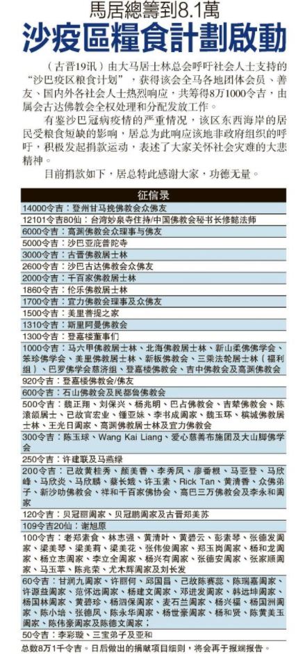 马佛教居士总会作为协办团体,总赞助三万马币作为斋僧育僧之用,其团体会员和个人会员也踊跃赞助。